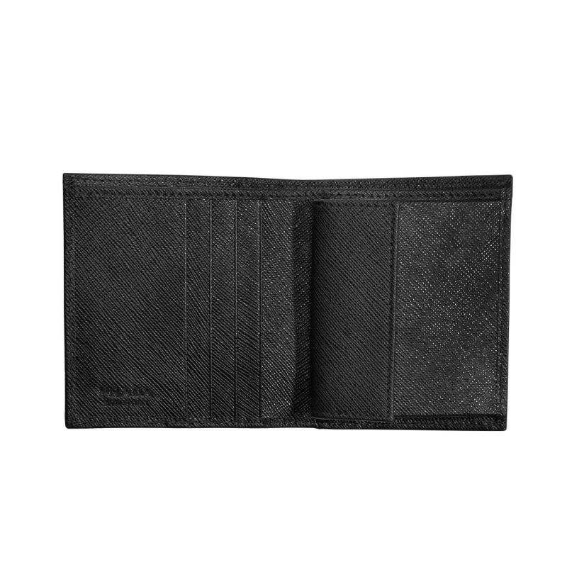 落ち着いたブラックカラーに飾られた三角ロゴプレートが、品のある男性らしさを醸し出す二つ折り財布★光沢を放つ本体は再生ナイロン「PRADA RE-NYLON」のエコニールで仕上げられており、カジュアルながらも高級感を漂わせる佇まい。細かな型押しが特徴的なサフィアーノレザーに切り替えられた内側は、紙幣入れやスリットポケット、カード入れやスナップ式の小銭入れが備えられた使いやすい作り◎ベーシックなカラーと洗練されたデザインは、普段使いからビジネスシーンまで幅広く活躍してくれるアイテム♪