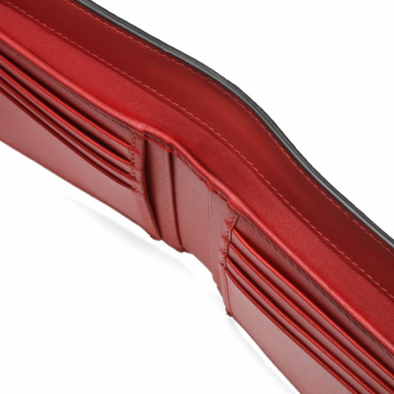 鮮やかなシグネチャーレッドカラーでライニングされた内側は、カード入れやスリットポケット、紙幣入れを配置◎