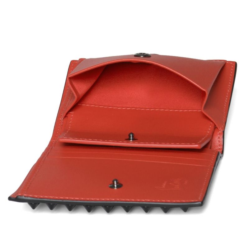 フロントに飾られた光沢を放つブラックカラーのスパイクスタッズが、クールなアクセントになった二つ折り財布「PAROS SPIKES(パロス スパイクス)」★本体は柔らかく優しい質感のカーフスキンで仕上げられており、繊細なシボや上品な艶が高級感溢れる表情を演出。鮮やかなシグネチャーレッドカラーで彩られた内側には、紙幣入れやカード入れ、スリットポケットやホック式の小銭入れが備えられた、コンパクトながらも実用的な作り◎ミニサイズで持ち運びがしやすく、シックなブラックカラーが大人の男性らしいカッコ良さを醸し出すアイテム♪