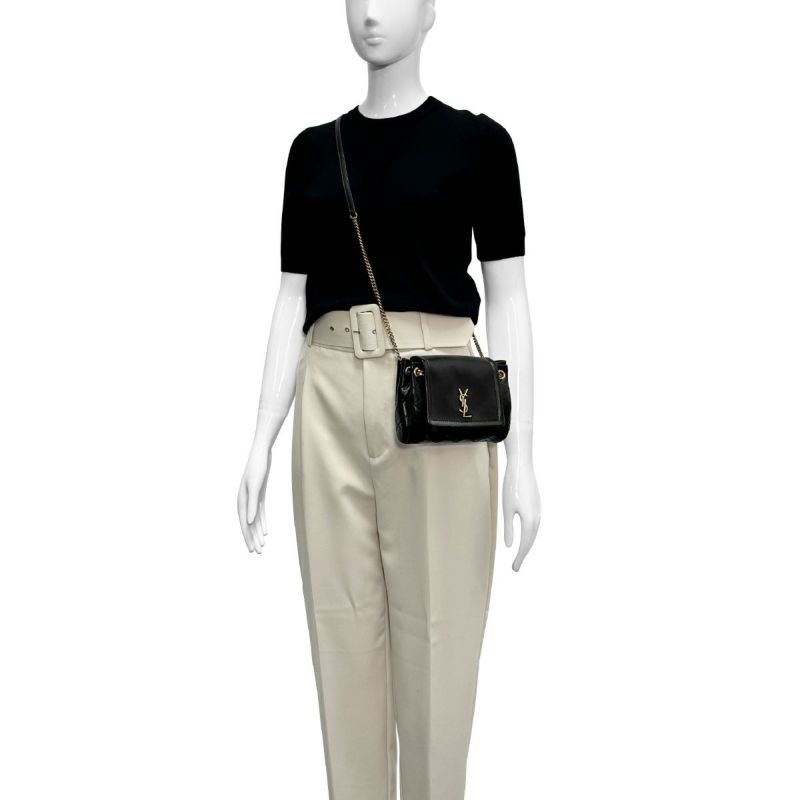 フロントに飾られたお馴染みのカサンドラロゴが、エレガントさを醸し出すショルダーバッグミニ「NOLITA(ノリータ)」★ソフトな質感の上質なラムスキンで仕上げられた本体は、キルティング加工があしらわれており、滑らかな手触りや美しい艶が高級感溢れる佇まい。内側は、小さめの財布や携帯電話、小物類が収納できるスペースに、便利なオープンポケットが1つ備えられた実用的なインテリア◎また、チェーンとレザーで構成されたショルダーが、オシャレなアクセントに!サンローラン パリらしい上品でクラシカルなデザインが、大人の女性を演出してくれるワンランク上のアイテム♪