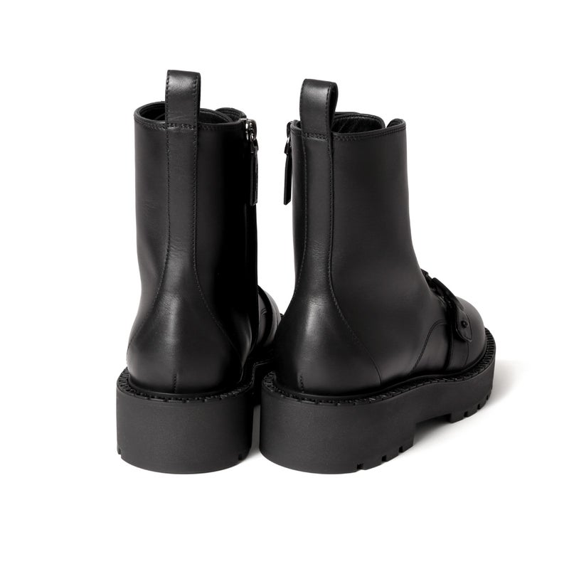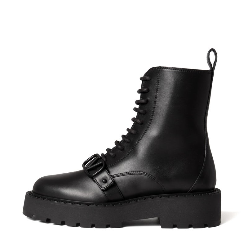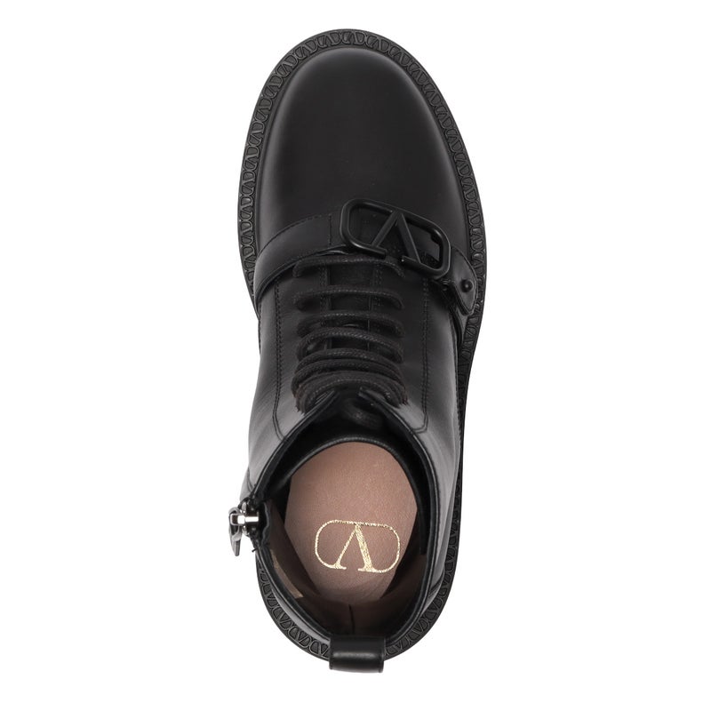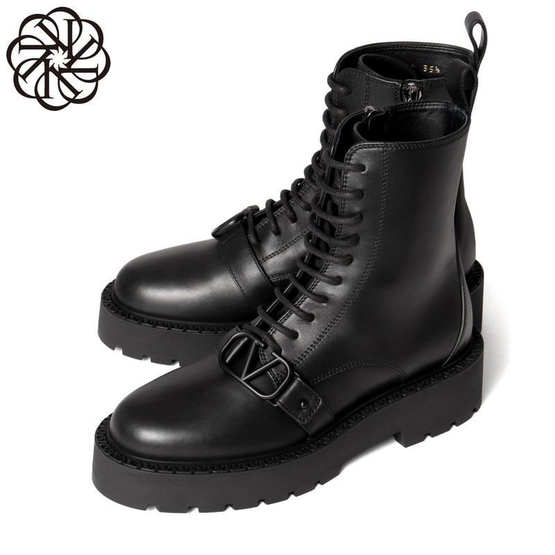 ベルトにブラックカラーで大きく飾られたVロゴのバックルが、エレガントさを漂わせるブーツショート★本体はしっかりとした丈夫なカーフスキンで仕上げられ、キレイな艶や滑らかな手触りが高級感溢れる表情を演出。また、シューレースで調整できる履き口や、サイドに備えられたファスナーにより、脱ぎ履きがしやすいデザイン◎さらに、凹凸のあるラバー製のソールは高さ約4.5cmで、スタイルアップ効果を発揮してくれるのも嬉しいポイント!足元の存在感がアップするボリューミーなコンバットブーツは、パンツにもスカートにも合わせやすいアイテム♪
