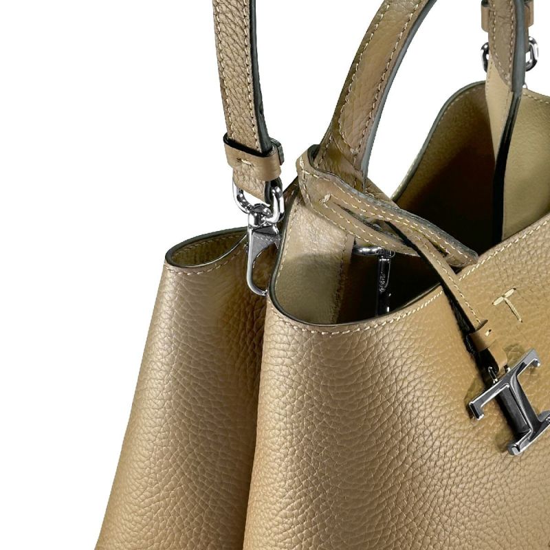 フロントに型押しされたロゴや前後にあしらわれたT字のステッチが、さり気ないワンポイントになったショルダー付きハンドバッグマイクロ「T TIMELESS(ティー タイムレス)」★