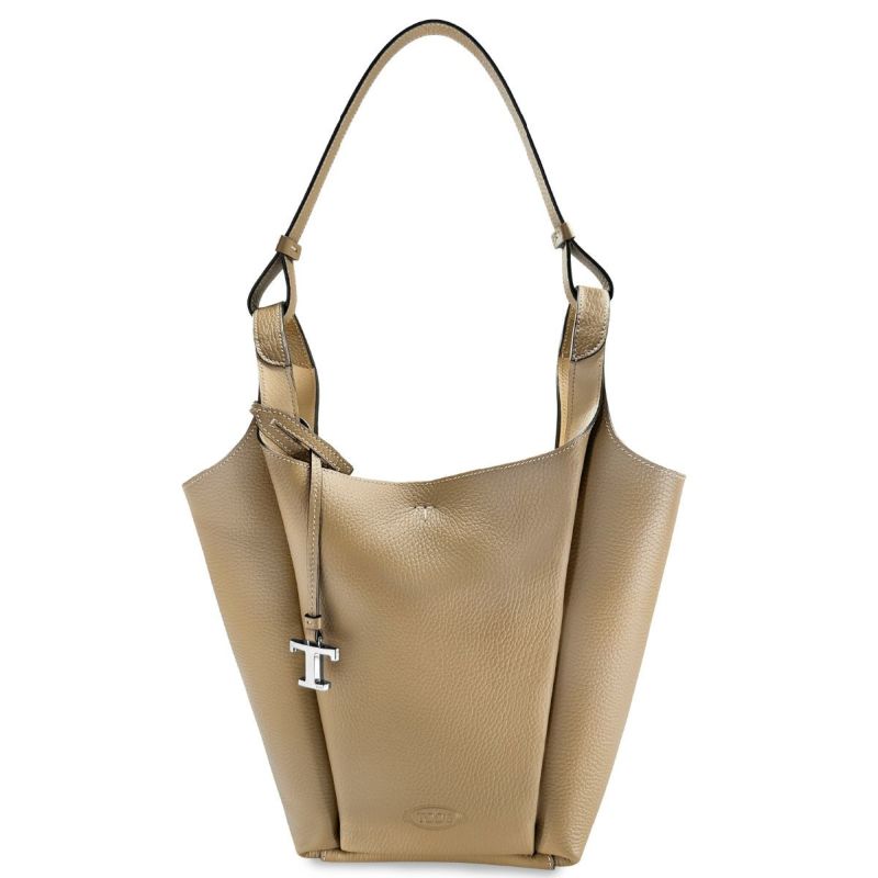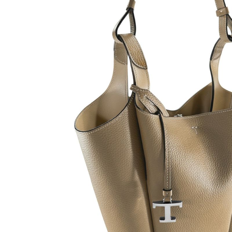 フロントに型押しされたロゴや前後にあしらわれたT字のステッチが、さり気ないワンポイントになったトートバッグスモール「T TIMELESS(ティー タイムレス)」★本体はソフトな質感のカーフスキンを使用し、キレイな艶や滑らかな手触りが高級感を漂わせる魅力的な佇まい。内側は3ルームに分けられ、長財布やポーチなどの必需品をたっぷり収納できる広めのスペースに、小物入れに便利なポケットが備えられた実用的なデザイン◎また、取り外し可能なT字のメタルチャーム付き!ベーシックなベージュカラーで合わせやすく、幅広いシーンで活躍してくれるオシャレアイテム♪