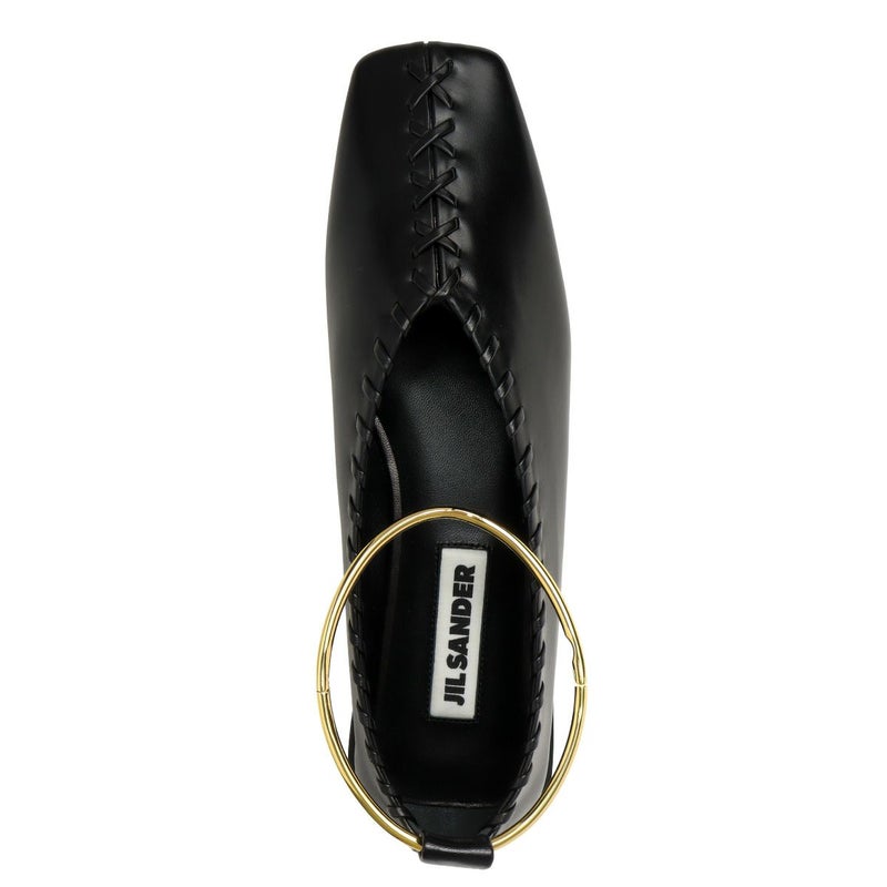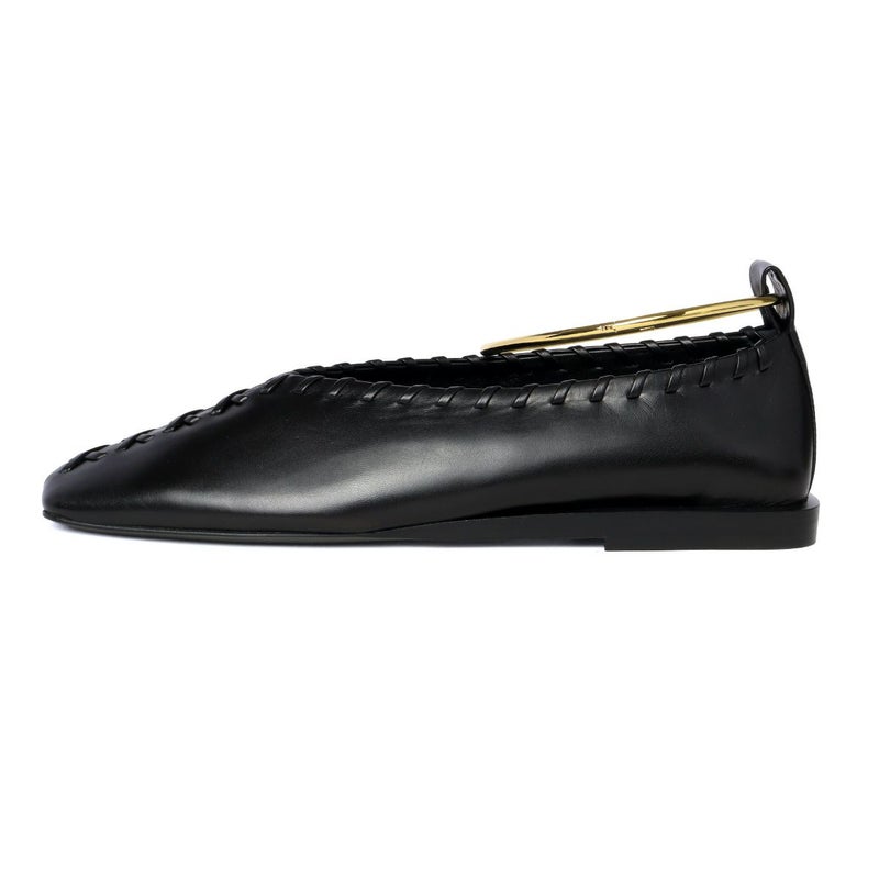 取り外し可能なメタルアンクルブレスレットが、オシャレなワンポイントとなったバレエシューズ「BALLERINA(バレリーナ)」★本体は滑らかで柔らかい質感のゴートスキンで仕上げられ、繊細なシワ感やキレイな光沢がエレガントさを演出。また、高さが約1.3cmのローヒールで歩きやすく、トゥ部分と履き口に施されたホイップステッチがさり気ないアクセントに!スッキリとしたフォルムやスクエアトゥが大人の女性らしい印象を放ち、毎日のスタイルに合わせやすいアイテム♪