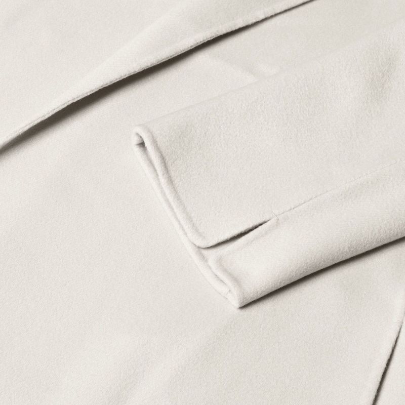 本体は暖かみのあるピュアヴァージンウールで作られ、二枚の生地を丁寧に重ねて一重に仕立てているので裏地がなく、柔らかく優しい肌触りと軽やかな着心地が魅力的。