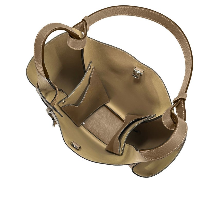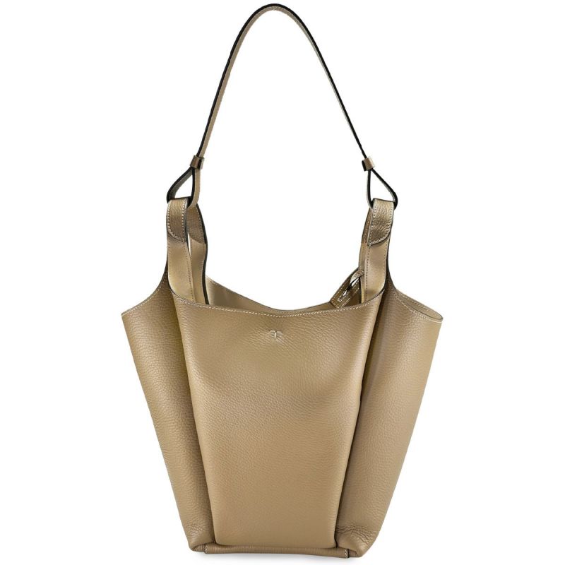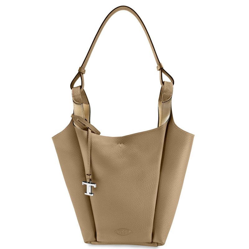 フロントに型押しされたロゴや前後にあしらわれたT字のステッチが、さり気ないワンポイントになったトートバッグスモール「T TIMELESS(ティー タイムレス)」★本体はソフトな質感のカーフスキンを使用し、キレイな艶や滑らかな手触りが高級感を漂わせる魅力的な佇まい。内側は3ルームに分けられ、長財布やポーチなどの必需品をたっぷり収納できる広めのスペースに、小物入れに便利なポケットが備えられた実用的なデザイン◎また、取り外し可能なT字のメタルチャーム付き!ベーシックなベージュカラーで合わせやすく、幅広いシーンで活躍してくれるオシャレアイテム♪