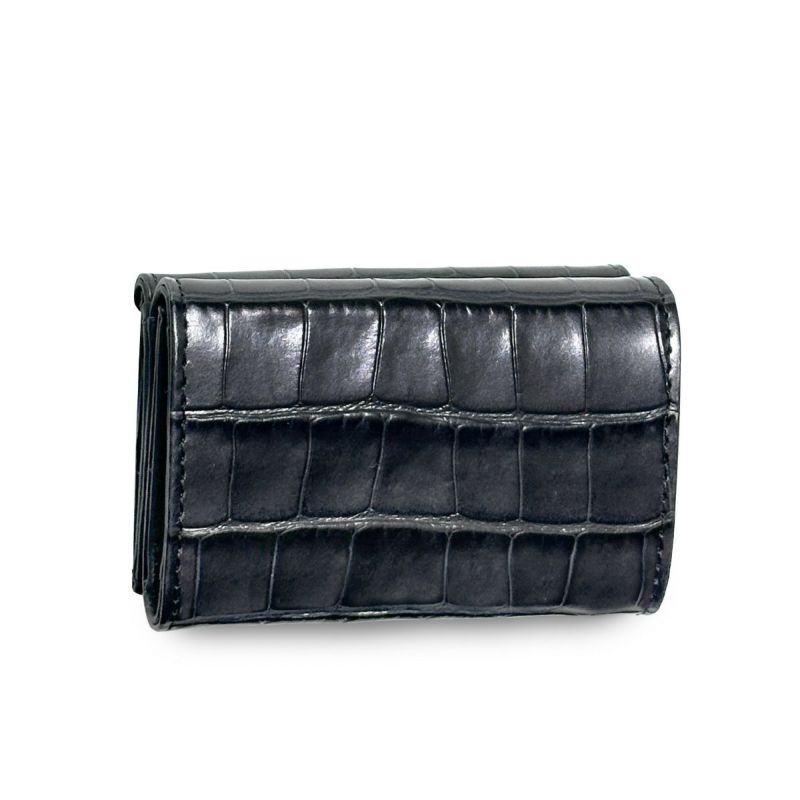 艶やかでつるりとした手触りの本体は、クロコダイル調に型押しが施されたレザーで仕上げられており、柔らかさがありながらも丈夫な佇まいで高級感溢れる表情を演出。