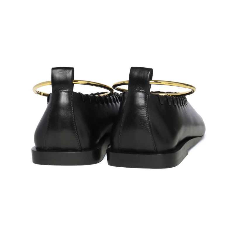 取り外し可能なメタルアンクルブレスレットが、オシャレなワンポイントとなったバレエシューズ「BALLERINA(バレリーナ)」★本体は滑らかで柔らかい質感のゴートスキンで仕上げられ、繊細なシワ感やキレイな光沢がエレガントさを演出。また、高さが約1.3cmのローヒールで歩きやすく、トゥ部分と履き口に施されたホイップステッチがさり気ないアクセントに!スッキリとしたフォルムやスクエアトゥが大人の女性らしい印象を放ち、毎日のスタイルに合わせやすいアイテム♪