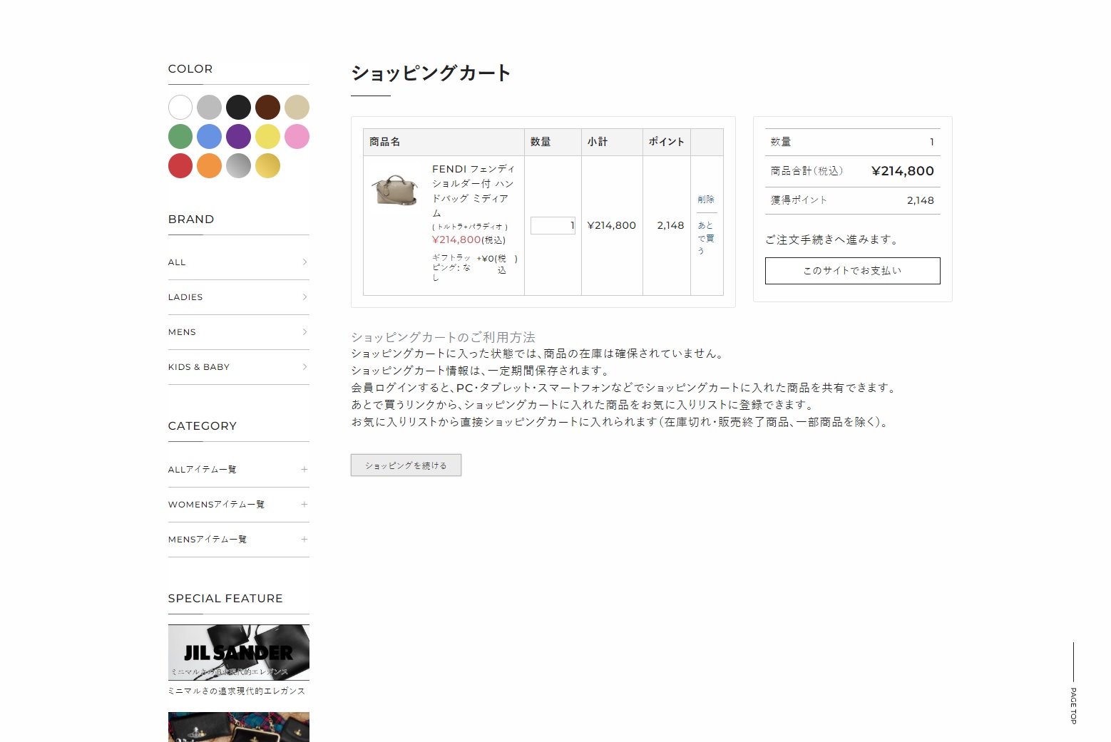 表示された商品名・数量・小計などの代金を確認し、お買い物を終了してご注文フォームの入力に進む場合は、このサイトでお支払いをクリックしてください。