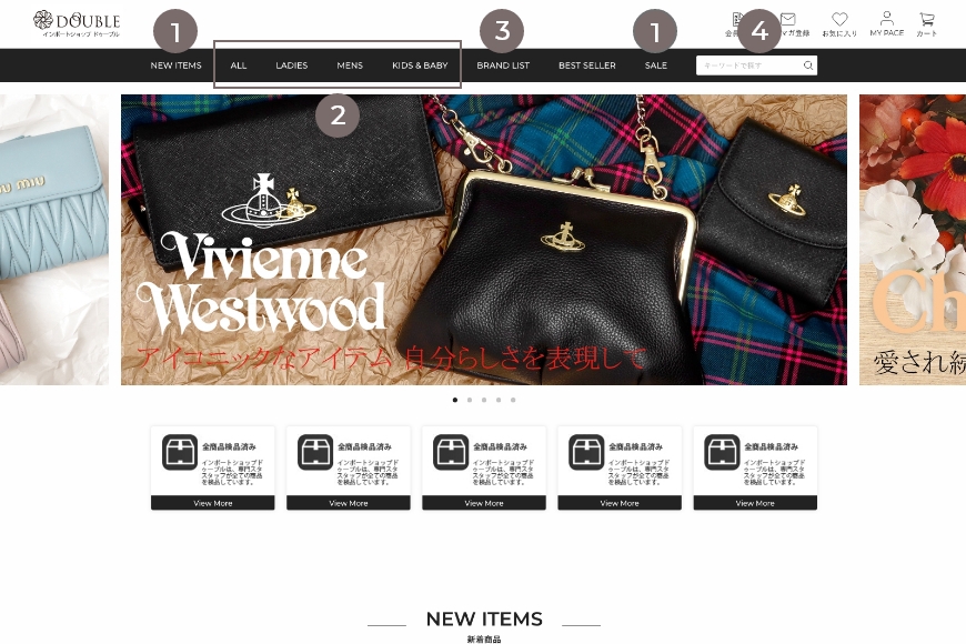 「ALL」「LADIES」「MENS」「KIDS&BABY」では、商品をアイテム別に分類してご案内しております。