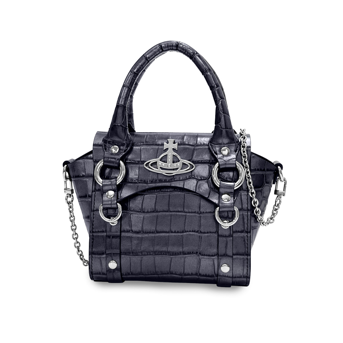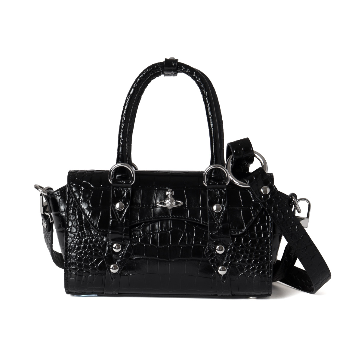 艶やかでつるりとした手触りの、クロコダイル調型押しカウレザーを使用したハンドバッグ。かっちりとしたスクエアフォルムが、上質なレザーの光沢感を引き立て、手元に圧倒的な存在感を与えます。象徴的なメタルオーブとクラシカルな気品が融合した、オンオフを問わずスタイルを格上げする一品です。