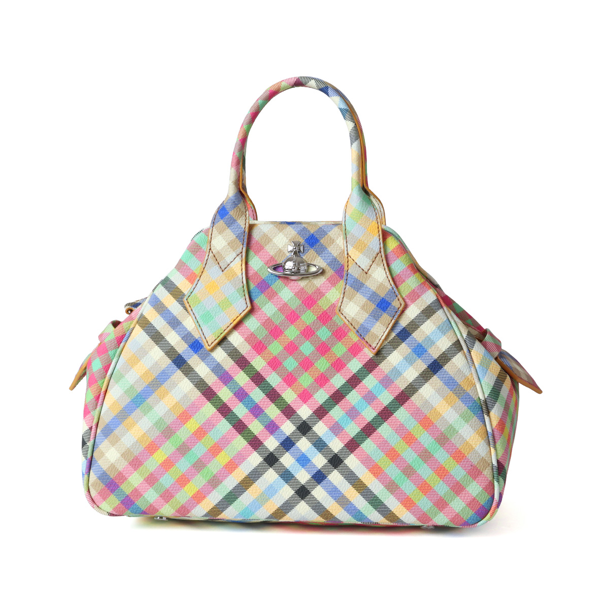鮮やかなマルチカラーのチェック柄を乗せたハンドバッグミディアム 。マチが広く収納力に優れた実用的なフォルムで、デイリーの装いに華やかなアクセントを添えてくれます。フロントに輝くメタルオーブが、ヴィヴィアンらしいパンクな遊び心と気品を両立させる一品です。