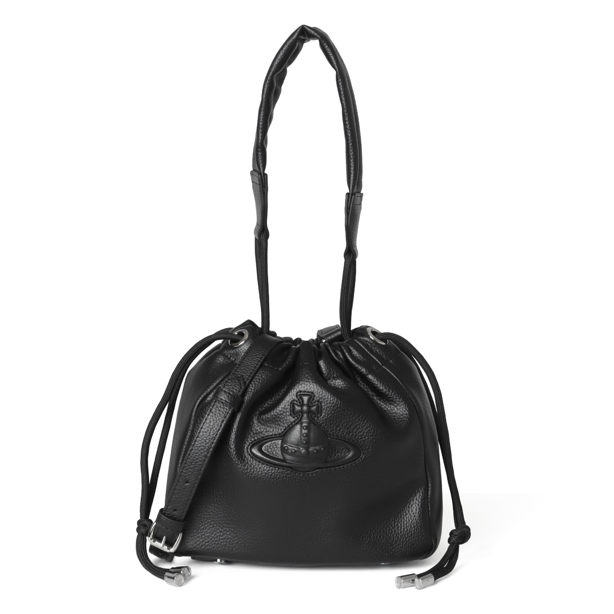 オーブモチーフが映えるバケットバッグ。環境に優しいヴィーガンレザーを使用し、柔らかな質感とシボ感が上品な印象です。二つ折り財布やスマートフォンが収まる実用的なサイズで、ハンドルは結び目で長さ調整できる2WAY仕様。